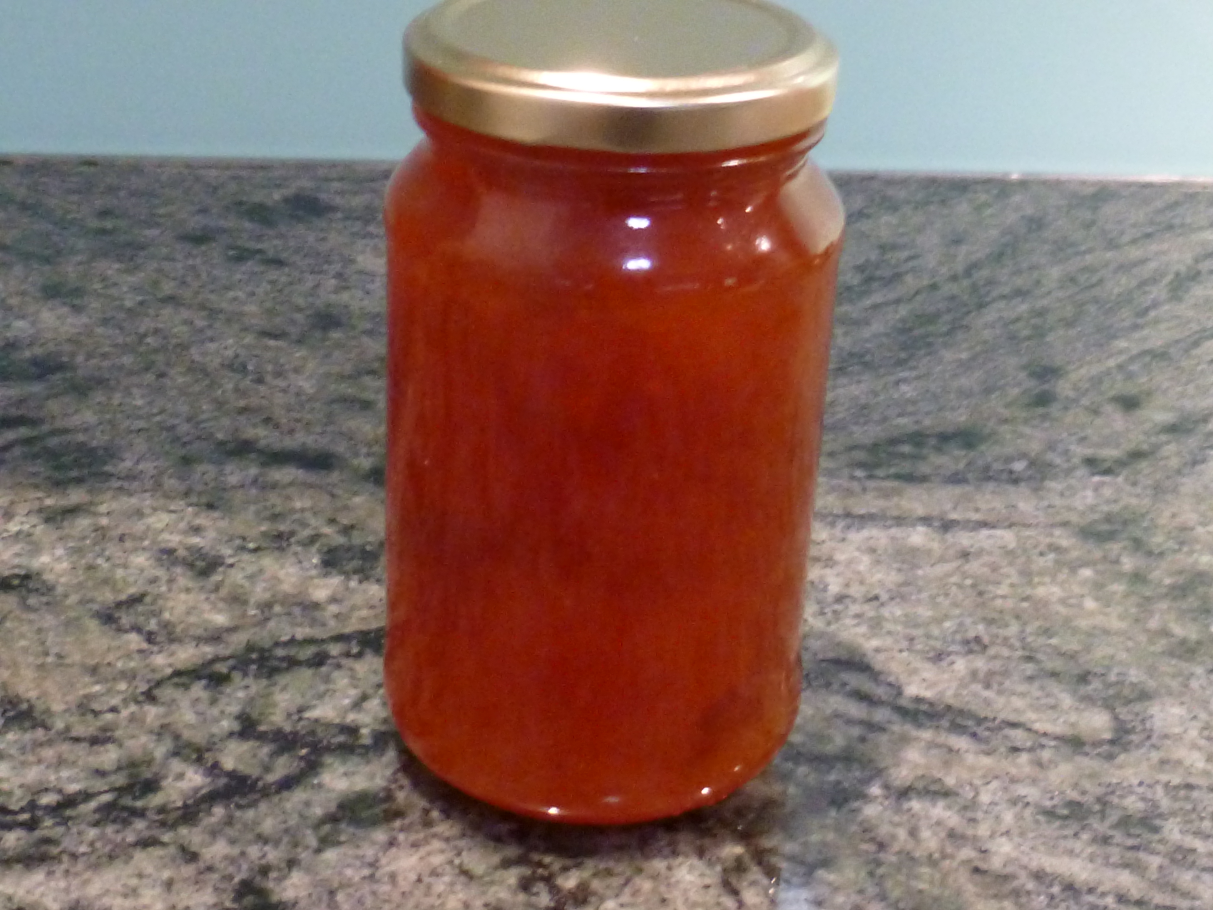 Take a quantity of apricots, preferably just ripe – I used 800 grams. If they are too ripe the jam won’t jell, and I will deal with the reasons for this in a separate post. Then cut the apricots in halves or quarters, and take out the stones. You can also peel them (scald in boiling water), but I don’t normally do this. Then take an equal amount of sugar, and sprinkle the half the sugar over the cut apricots in layers. Leave overnight, or at least 4-6 hours. By then the apricots should render a lot of juice. Add the apricots to a preserving pan with the remainder of the sugar, and heat gently until the sugar is dissolved. Add the strained juice of one lemon; more if you increase the quantity of apricots. The mixture mustn’t be allowed to boil until the sugar is all dissolved and if necessary, add a little water to assist the process – I added around a cup as the mixture was too thick, and wouldn’t have had time to boil enough before jelling. Stir with a wooden spoon during this part of the process. Allow to come to jelling point, and test for setting point either with a jelly thermometer (104 degrees), or if the mixture “sheets” off the wooden spoon, or wrinkles when cooled on a plate and a finger is run through. Apricot jam will suddenly jell, so watch carefully after around 15-20 minutes. It also has a tendency to burn, so watch carefully for this, and stir frequently. The time taken to jell will be somewhere around 20 minutes, depending on your quantity of apricots, and a few other factors including how quickly it is boiled.
