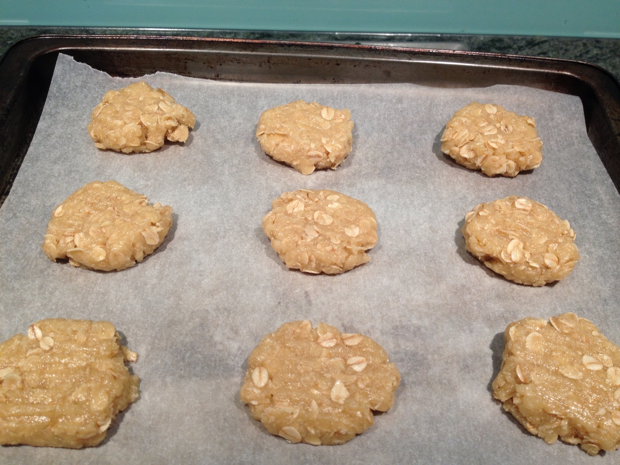 Bake for 12-15 minutes in moderate oven (180 degrees), checking after 12 minutes. When golden brown, remove from oven and allow to sit for a few minutes, then slide onto a cooling tray. The easiest way to do this if the biscuits are still hot is to slide them off the baking tray still on the baking paper. As they cool, they will crisp up and harden.