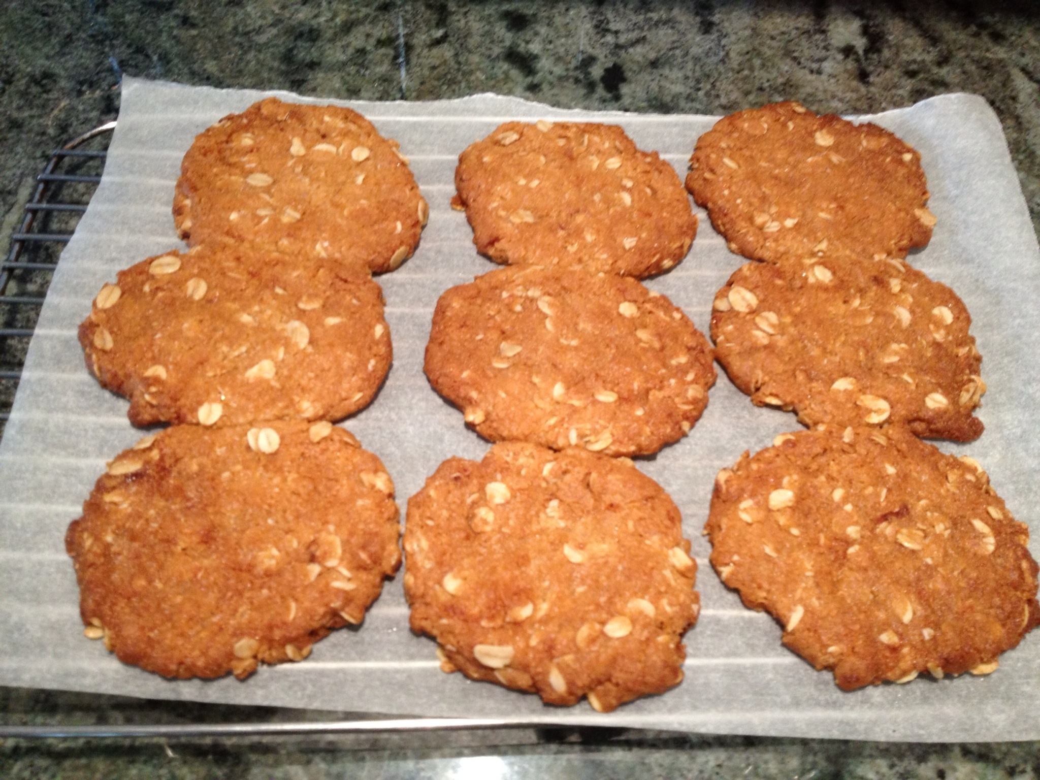 Anzac biscuits are an Australian and New Zealand Anzac Day tradition. There are as many recipes around as there are stories as to the origins of the biscuits. Legend says that they were made to send to the troops in World War I serving in Europe, but it seems that the original biscuit, or tiles, as they were called, were much harder and long lasting with more basic ingredients. Interestingly, the name “Anzac” is protected in Australia with an exemption for the biscuits, provided they stay true to the original recipe. Although rolled oats, sugar, coconut, flour, butter and golden syrup and bicarbonate of soda are now key ingredients (never eggs), coconut was not included in the original tile recipe, available on the Australian War Memorial website. There are a lot of recipe variations available, but they should still contain the traditional ingredients, not macadamias, ginger, chocolate, and all manner of other things. Some recipes use less sugar than this, but I checked this against the recipe published by the Australian War Memorial, which also uses one cup of sugar, but amend to your own taste.