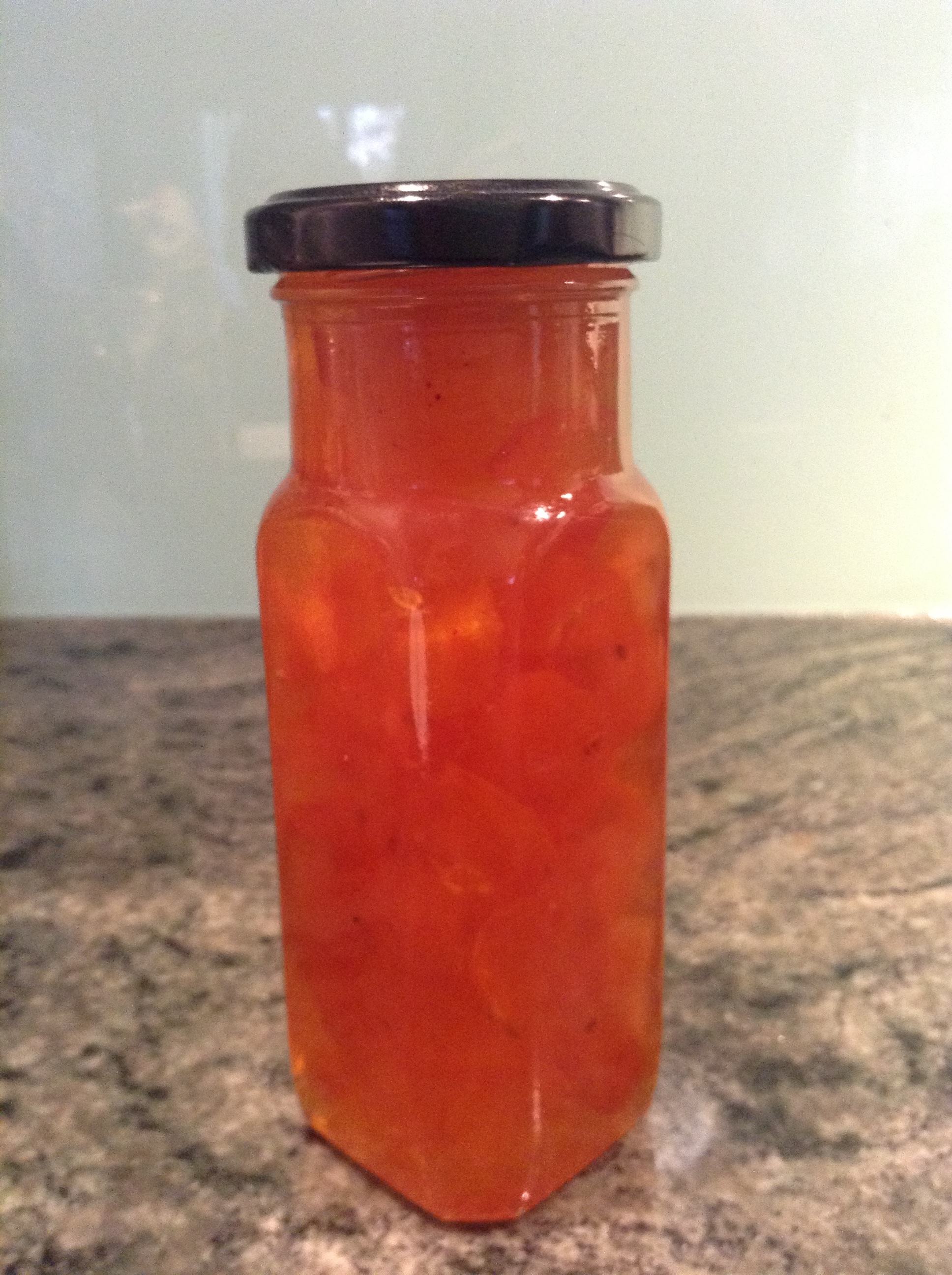 Add the water to the cumquats in a microwave proof dish (mine was about 3 litres), and microwave on high for 10 minutes until the cumquats are cooked and the rind tender. Add the sugar and stir well, so that the sugar dissolves before you boil the mix. Microwave on high until the mixture jells, and the marmalade “sheets” off the spoon (see other posts on cooking jams and marmalades to see what this means). This took around 25-30 minutes. Allow to sit for 5 minutes, then bottle and seal immediately.