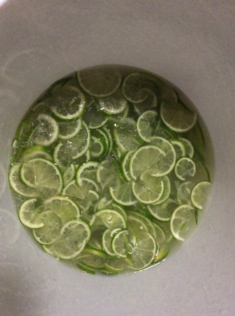 Top and tail the limes, cut into half longways, and thinly slice. For Show work, you need to slice very finely. Put the lime slices in a large container, just cover with water and soak (covered) overnight or at least three to four hours.
