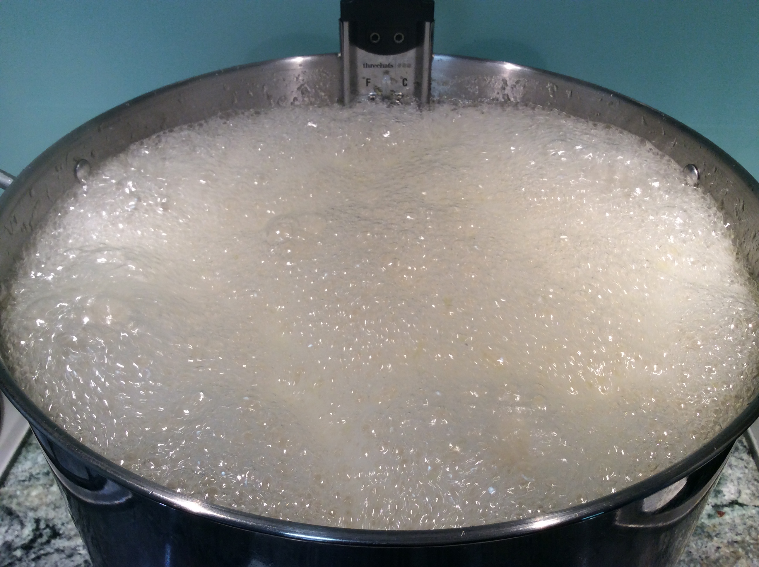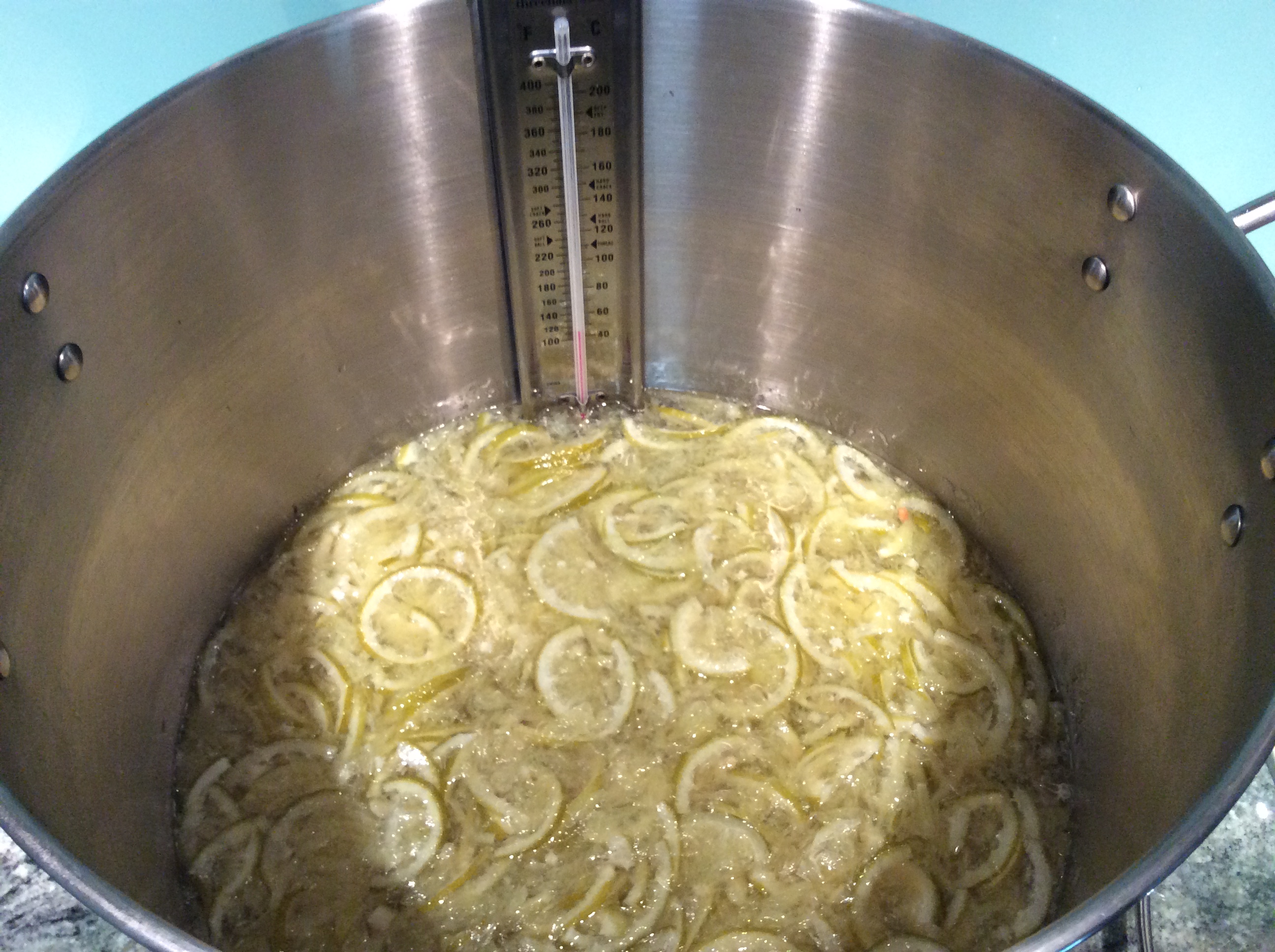 After adding sugar to the pan, add your candy thermometer (if you have one), and turn on the heat, ensuring that you allow the sugar to fully dissolve before it comes to the boil. At that point, boil the mixture rapidly until it comes to setting point, which is 104 degrees. The mixture at that point will come to a rolling boil, and will spit. You can also test for set using a small amount on a cold plate which will wrinkle, or use the spoon test, where the thickened mixture will “sheet” off the spoon. Watch the pan carefully at this point, as it will have a tendency to boil over. If this happens, when you are finished, add water to the spill and it is easy to clean up.
