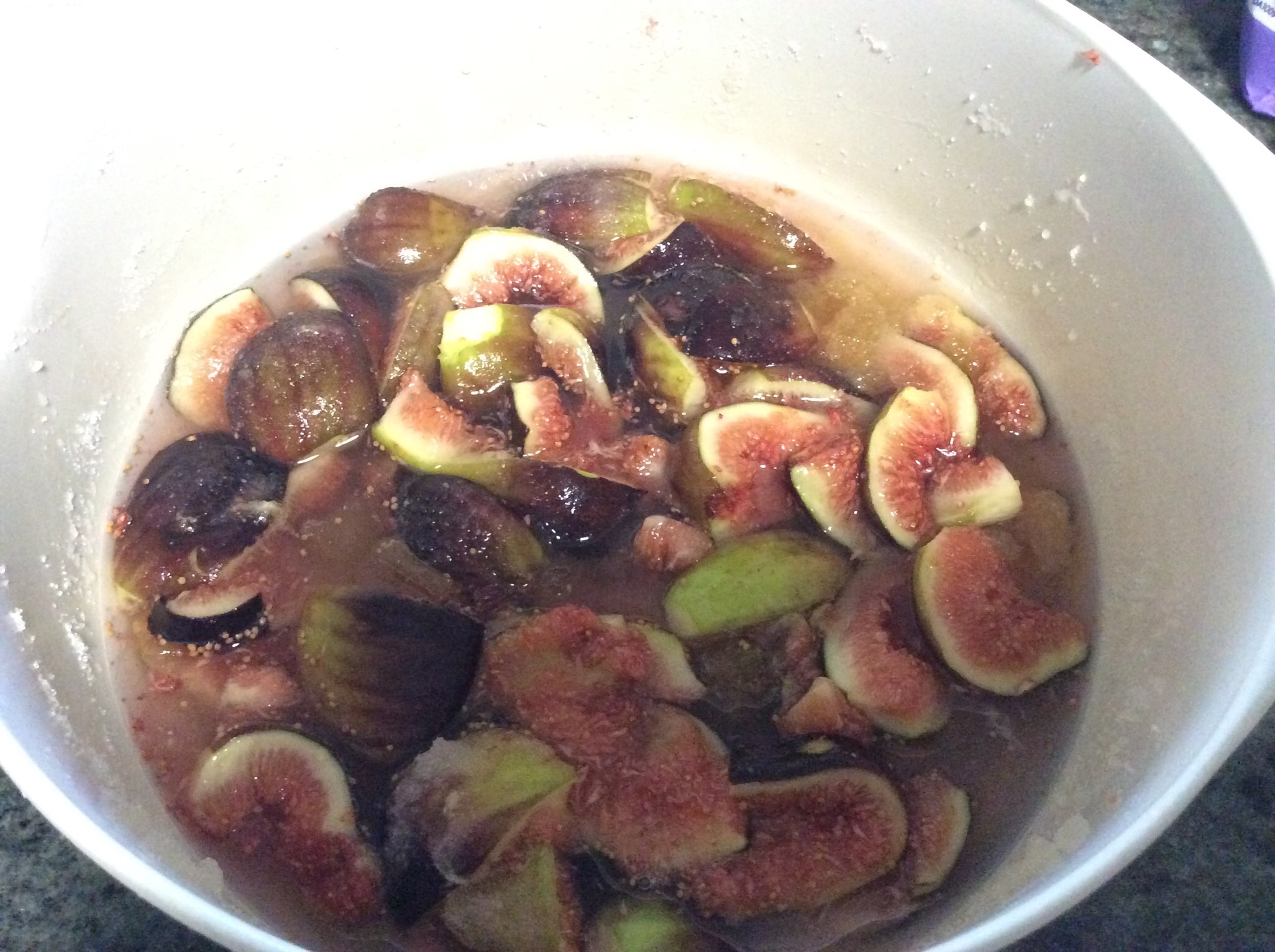 Leave 3-4 hours until the sugar “dissolves” and the figs disgorge some of their liquid. You shouldn’t be able to see the white sugar anymore. Place into a large pot to make the jam, and add juice of a lemon or lime. I used two limes as they are in season and limes are smaller than lemons. The acid in the citrus is important to get the jam to set. If your figs are a little overripe, I would add a little more lemon or lime juice. Don’t add any water to the mixture with this method.