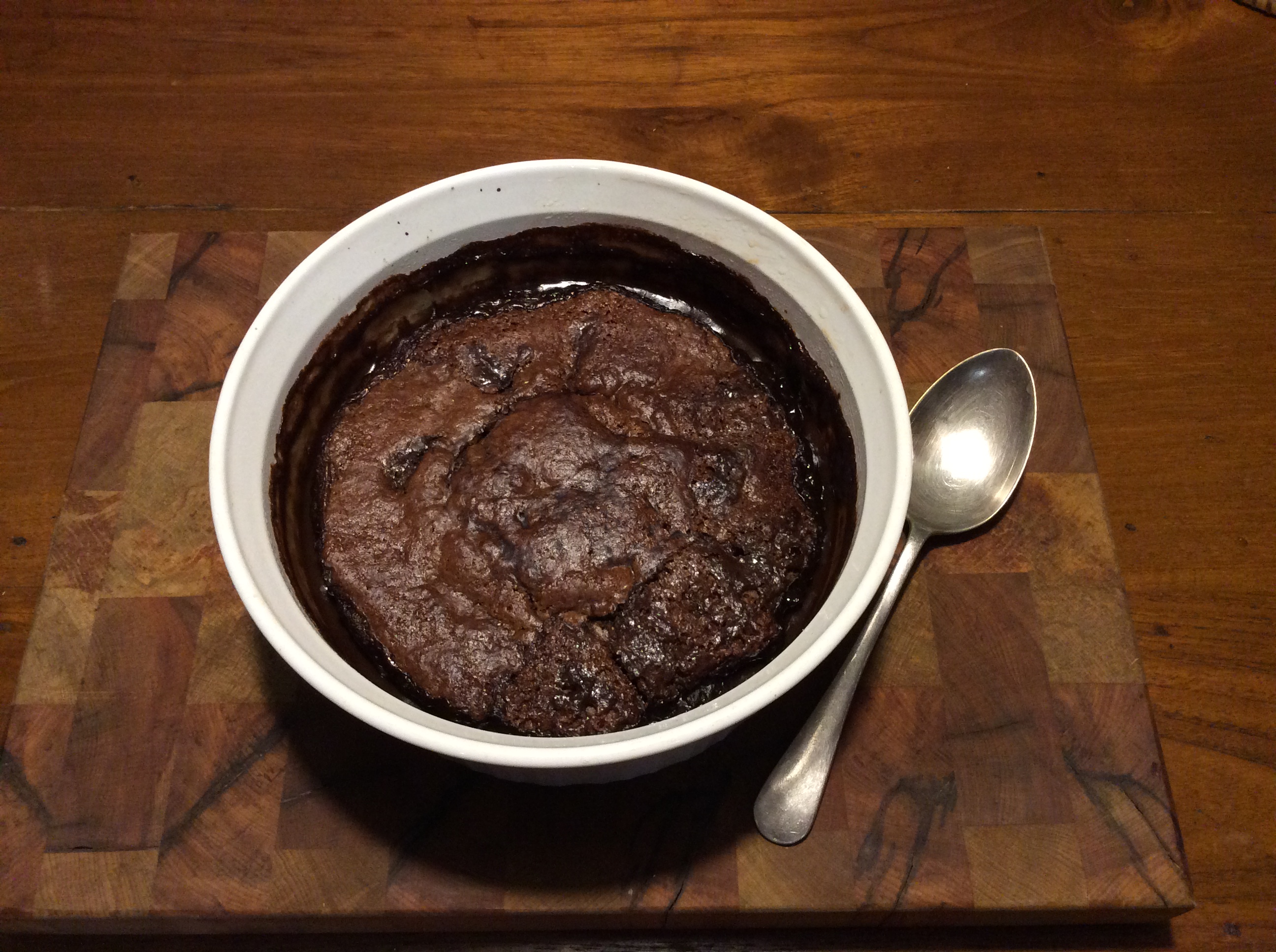 I don’t make this claim lightly, but this is the best version of a chocolate self-saucing pudding that I’ve ever tasted! The recipe comes from my mother, many years ago, and I don’t know its origin, but it’s very similar to one featured in the cookbook bistro, by the wonderful Philip Johnson, owner and chef of the highly decorated e’cco bistro in Brisbane. I was fortunate to attend the launch of that book in 2004, where Philip spoke about the origins of his recipe in New Zealand, with his own mother and a school or community cookbook. The main difference between his and mine is that mine doesn’t have an egg in the cake mix (and he has swapped in some chopped chocolate with less sugar), but other than that, the similarity is such that they must have had the same origin, 50+ years ago, and I spoke with him about it when he signed my copy of the book, which I still treasure. It demonstrates that sometimes the origin of recipes can’t be traced, but small tweaks (like my version having no egg), creep in. I’ve seen many versions of this classic home-cooked pudding, but none as good as this one, at least in my view! Here is my version: